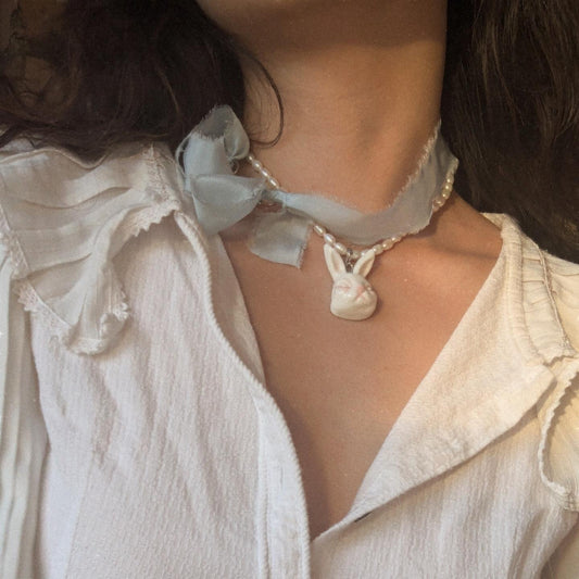 Grumpy Bunny- Pearl and Rabbit Bowtie Necklace