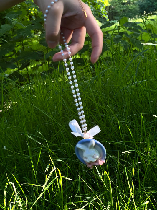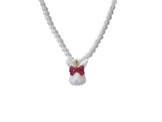 Grumpy Bunny- Pearl and Rabbit Bowtie Necklace