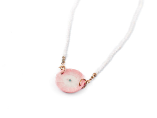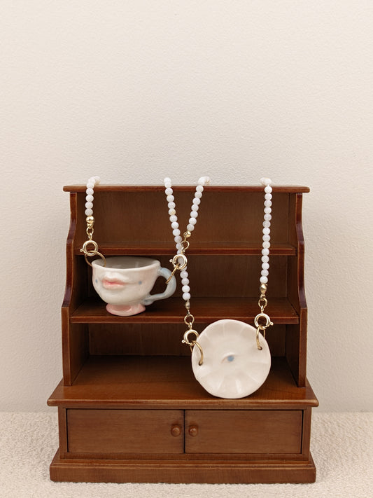 The Cup Theater mini cup and plate porcelain Freshwater Pearl necklace