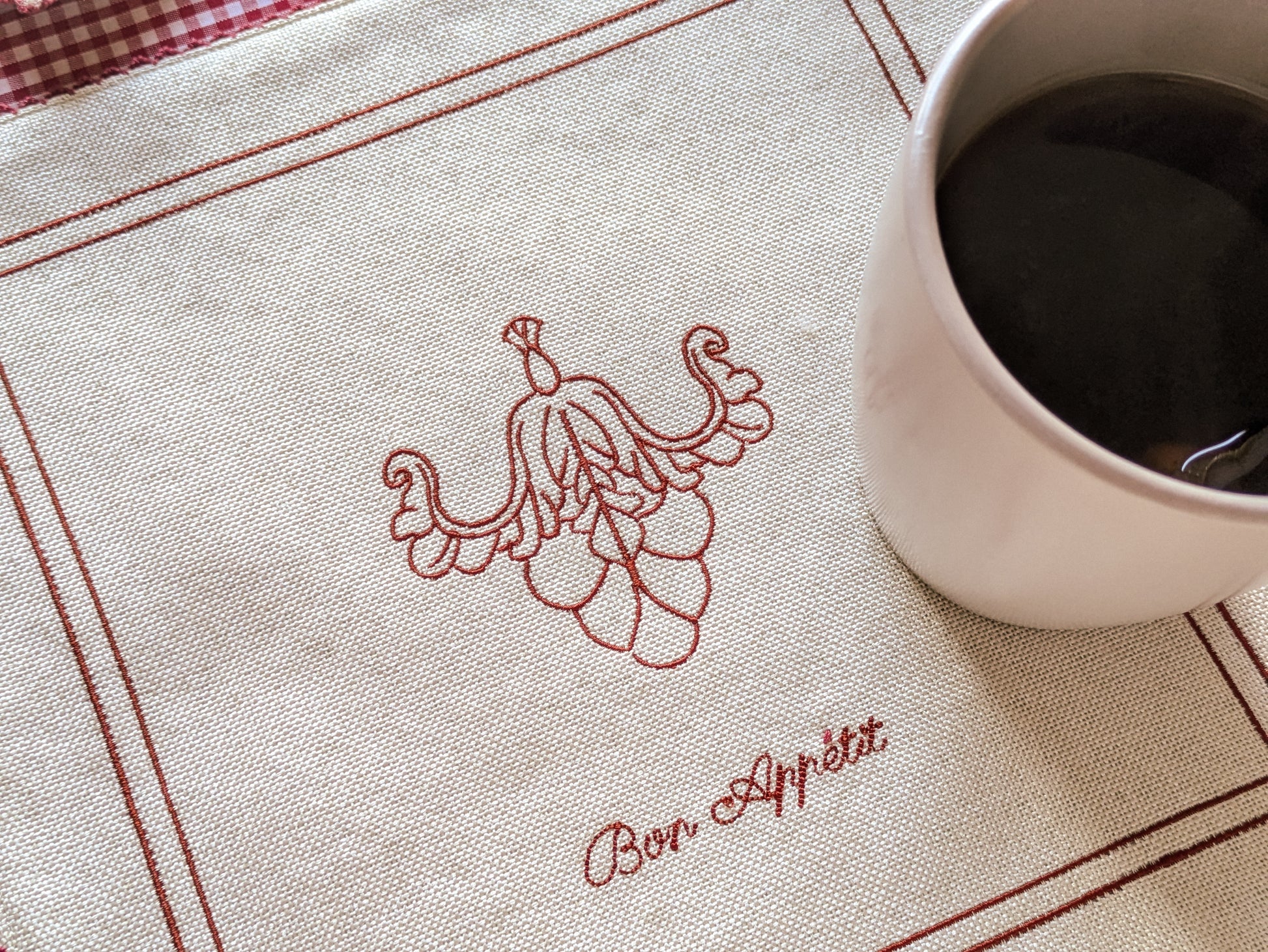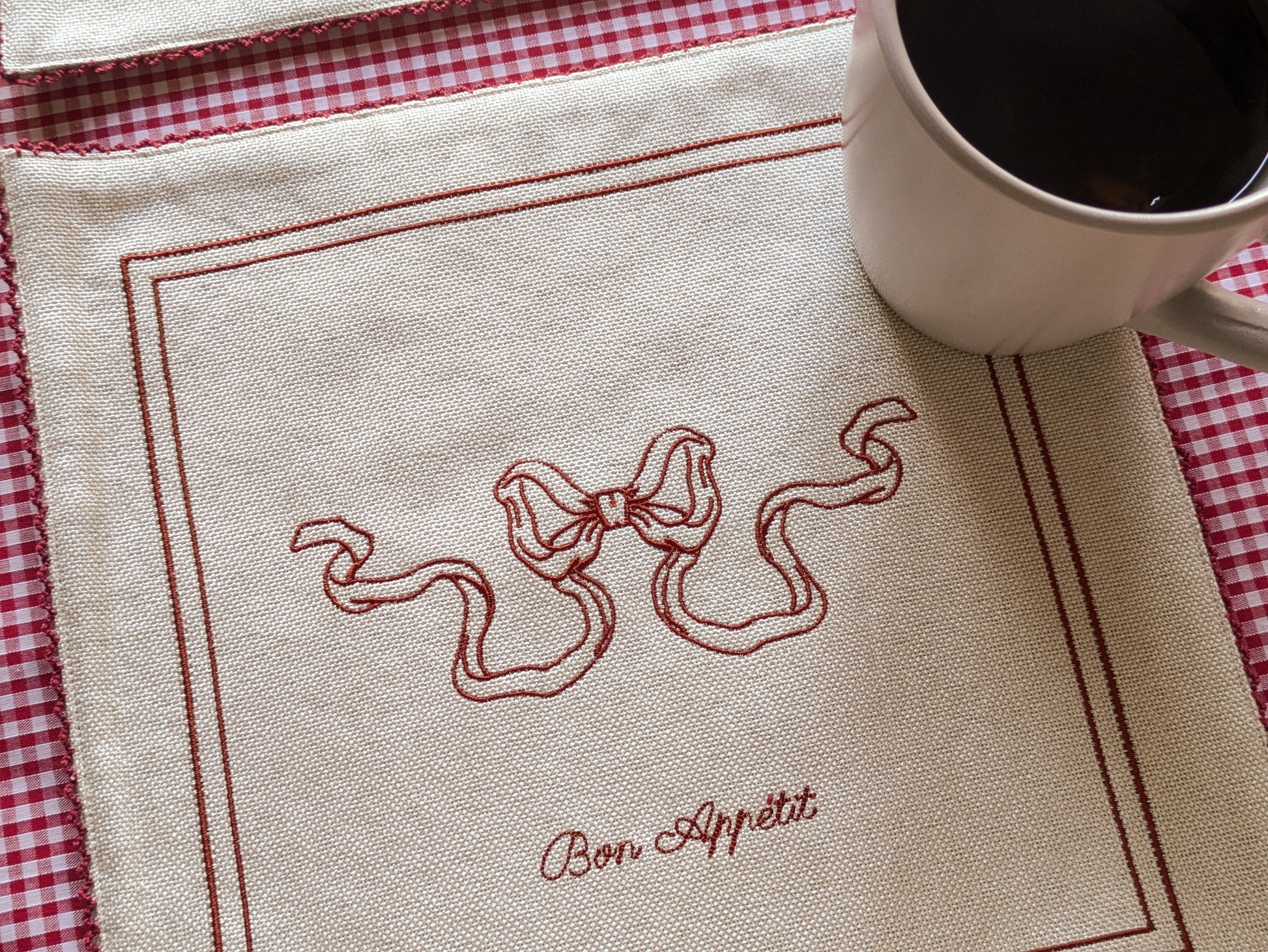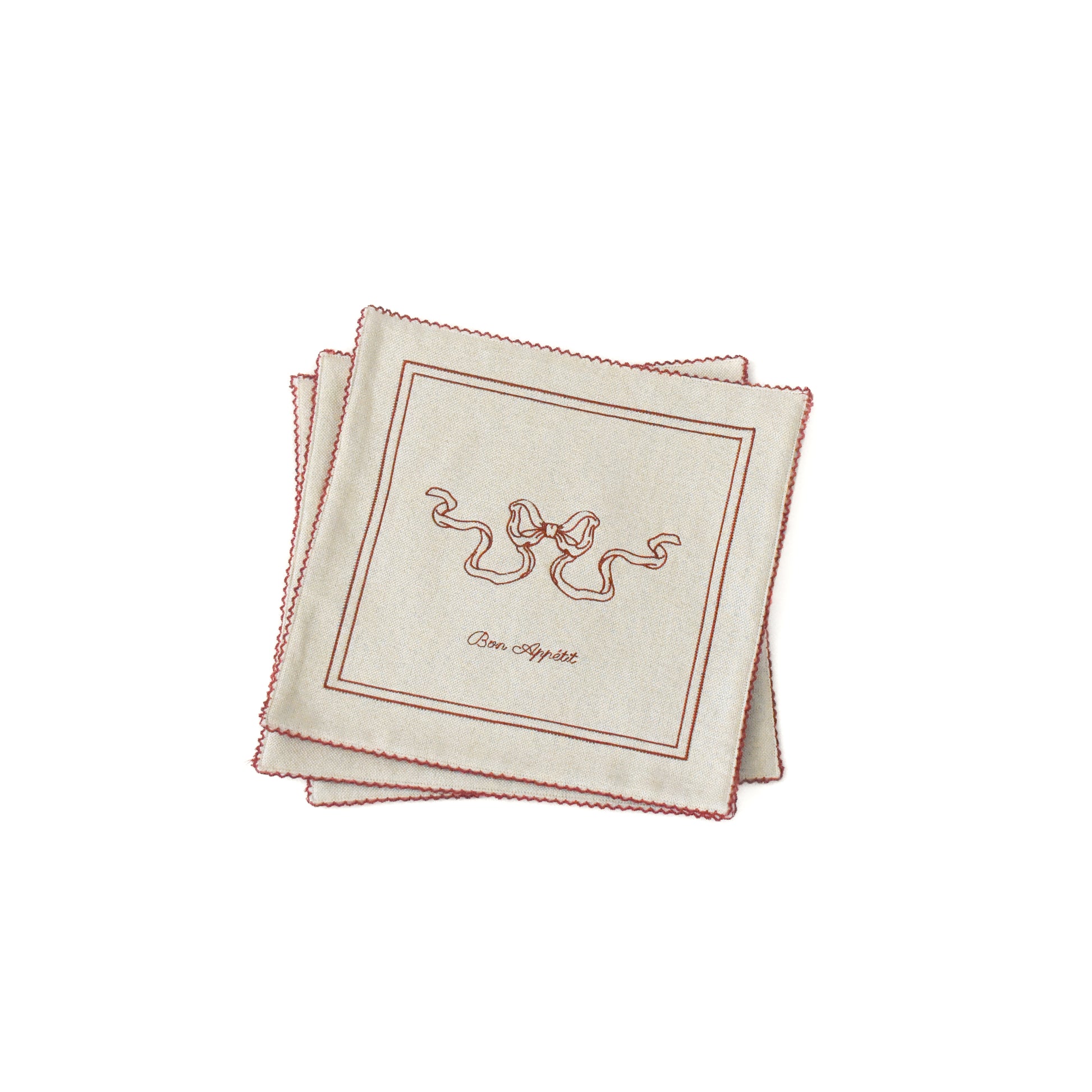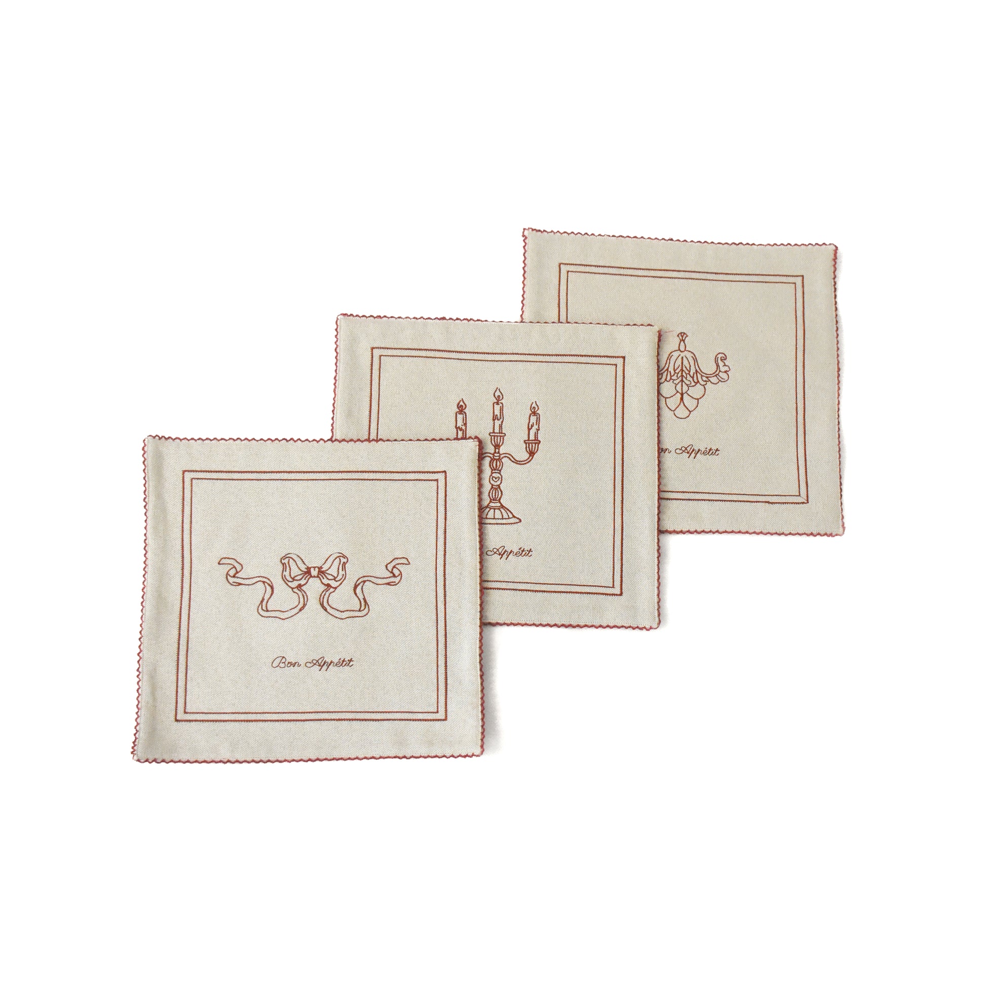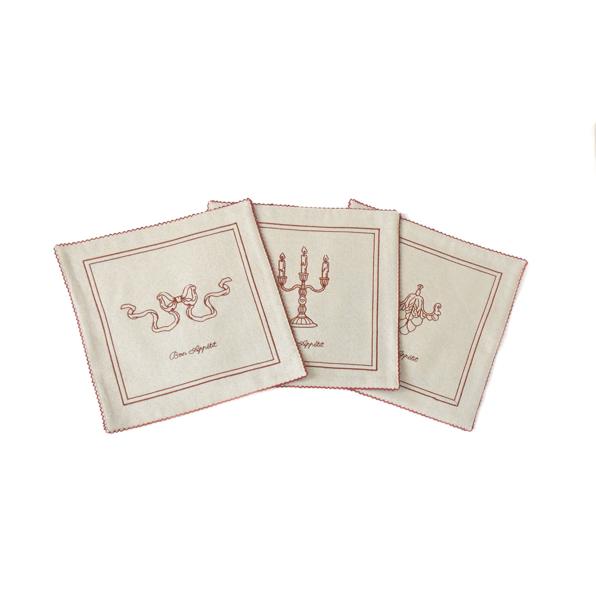 Elegant Vintage-Inspired Embroidered Tea Towel Set – Candelabra & Bow & Vine Design -3 piece set small red cream beige